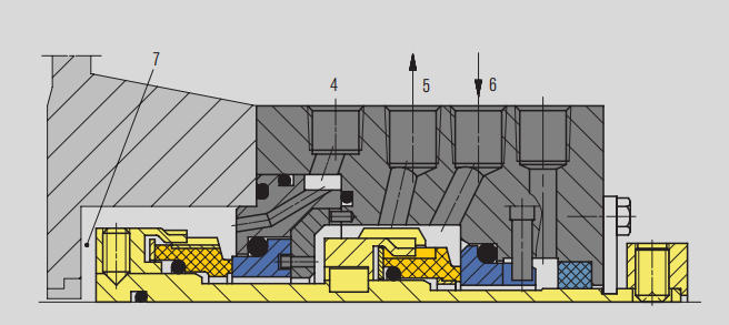 1. Pompanın yüksek basınç alanından (pompa tahliyesi veya pompa tahliye boru hattı) 3. Yıkama portu (F) 4.Soğutucu (Q) 5.Boşaltma portu (D) 6. Mühür haznesi